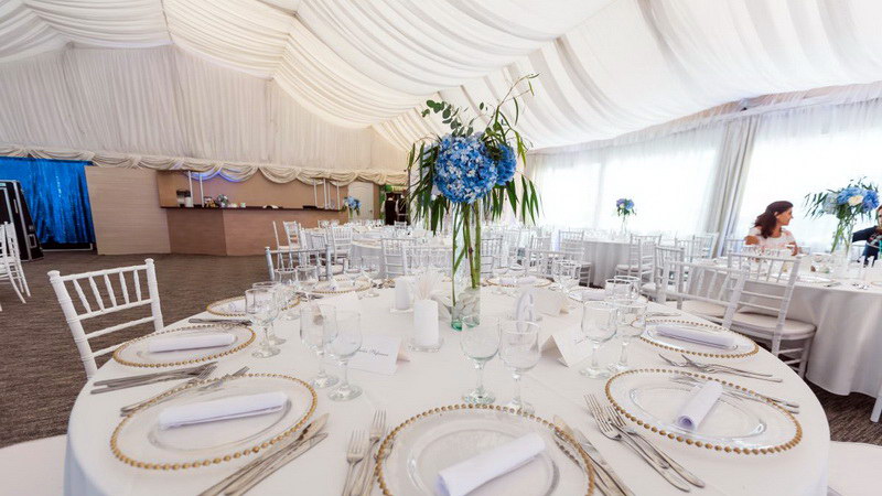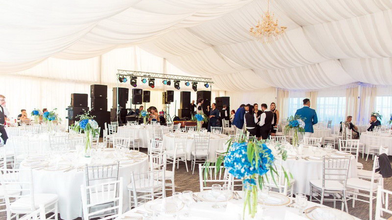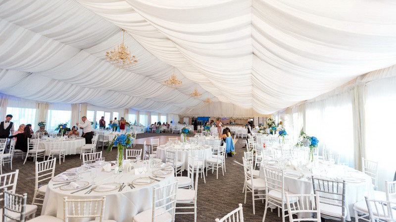 Salonul de evenimente este reprezentat de un elegant cort in stil american, complet izolat si partitionat, imbracat in sute de drapaje de matase, care poate gazdui pana la 350 persoane la mese sau 550 persoane standing (tip bufet suedez).