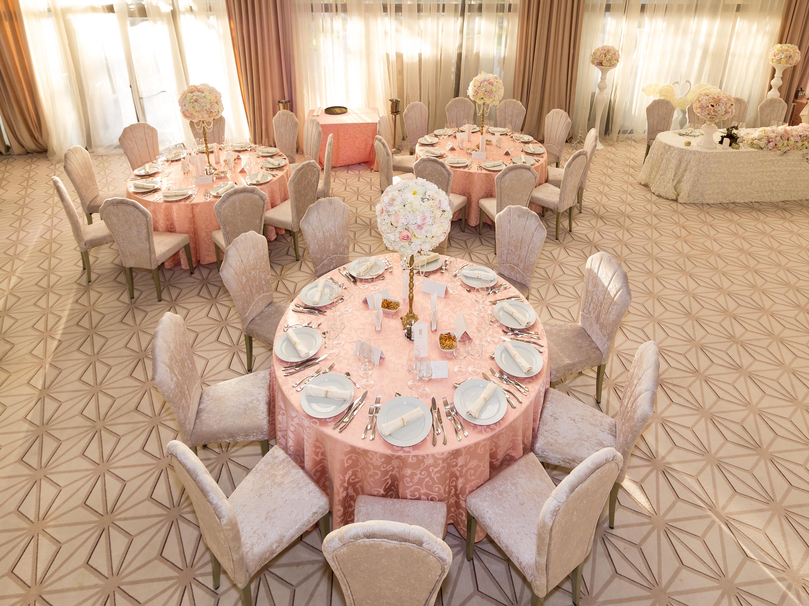 Locația beneficiază de facilități multiple: parcare privată, garderobe, apartamente matrimoniale și de relaxare, lobby-uri cu intrări separate, recepții și lounge-uri, toate deservite de o echipă complexă în organizarea de evenimente.