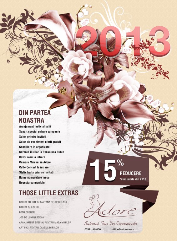 Destinatia mai multor tipuri de evenimente: nunti, botezuri, aniversari si evenimente corporate – Sala Adore – eleganta si rafinata, va asigura cadrul ideal pentru petrecerea celor mai importante momente din viata Dumneavoastra!