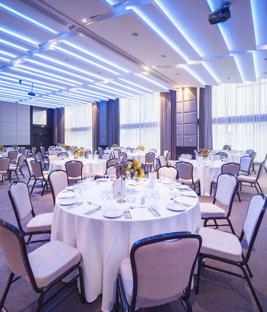 Ballroomul are o suprafata totala de 554 mp si o capacitate de aproximativ 430 de persoane in aranjament cu mese rotunde.